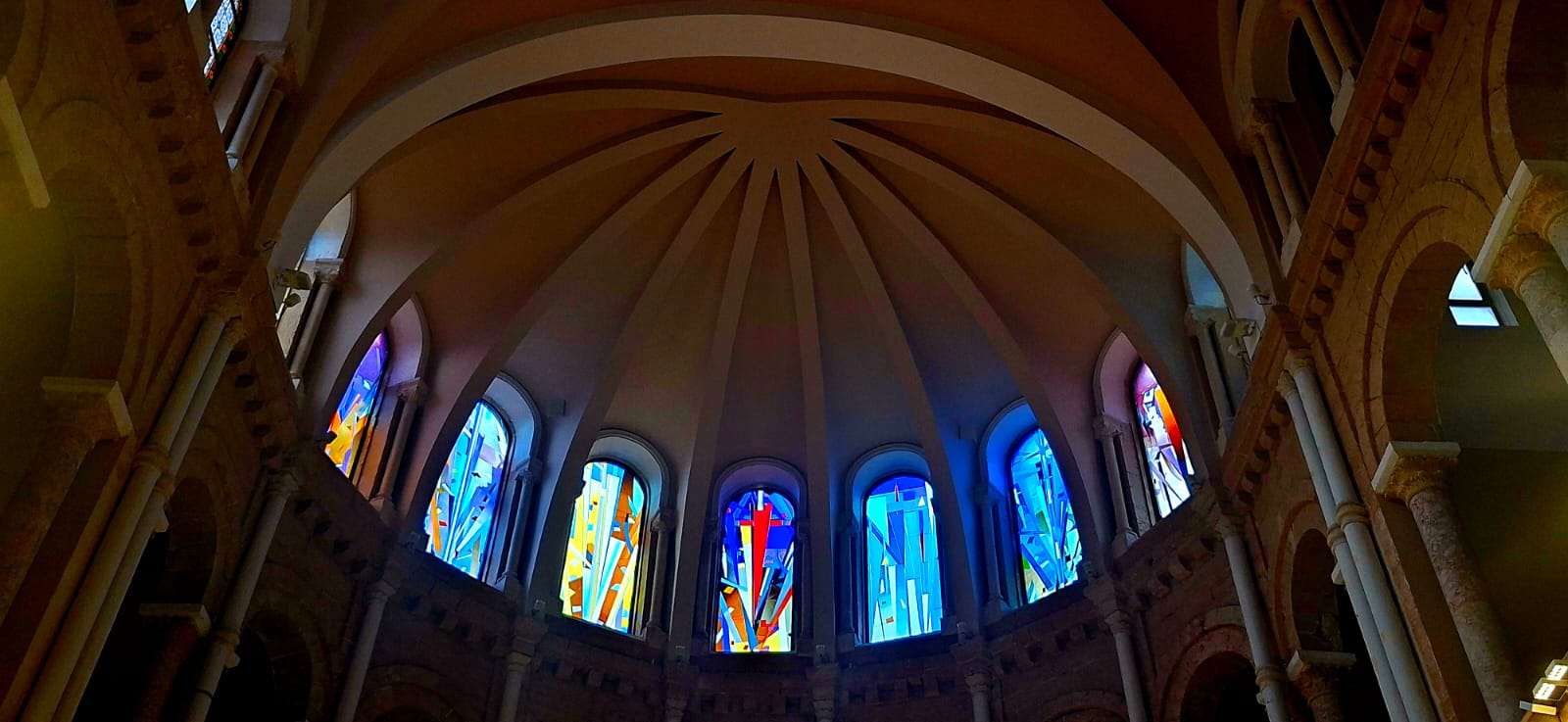 ما يلفت الانتباه فور دخولنا الكنيسة هو سطوع الزجاج الملون. يمكننا أن نتأثر بالانسجام الكبير الذي ينبعث من هذه المجموعة الجميلة من الزجاج. ومع ذلك، لا توجد نافذة تشبه الأخرى. وهذا دليل على أنّ الروح يجمع بين الوحدة والتنوّع. تبرز الخطوط العمودية التبادل المستمرّ بين السماء والأرض منذ أن أصبح الابن واحدًا مثلنا ليكشف لنا، بشكل نهائي على الصليب، حبّ الله اللامحدود للبشريّة. “جانب مطعون، ينبوع مفتوح، روح نعمة وصلاة. رأى المسيحيون الأوائل […] هذا الوعد يتحقّق في جانب المسيح المطعون، المنبع الذي تنبثق منه الحياة الجديدة […] المنبع المفتوح هو جانب يسوع المسيح المجروح. […] كلّ شيء سيتحقق في ينبوع الصليب الفائض (لقد أحبّنا، للبابا فرنسيس عن الحب البشريّ والإلهي في قلب يسوع المسيح، رقم 96-97).